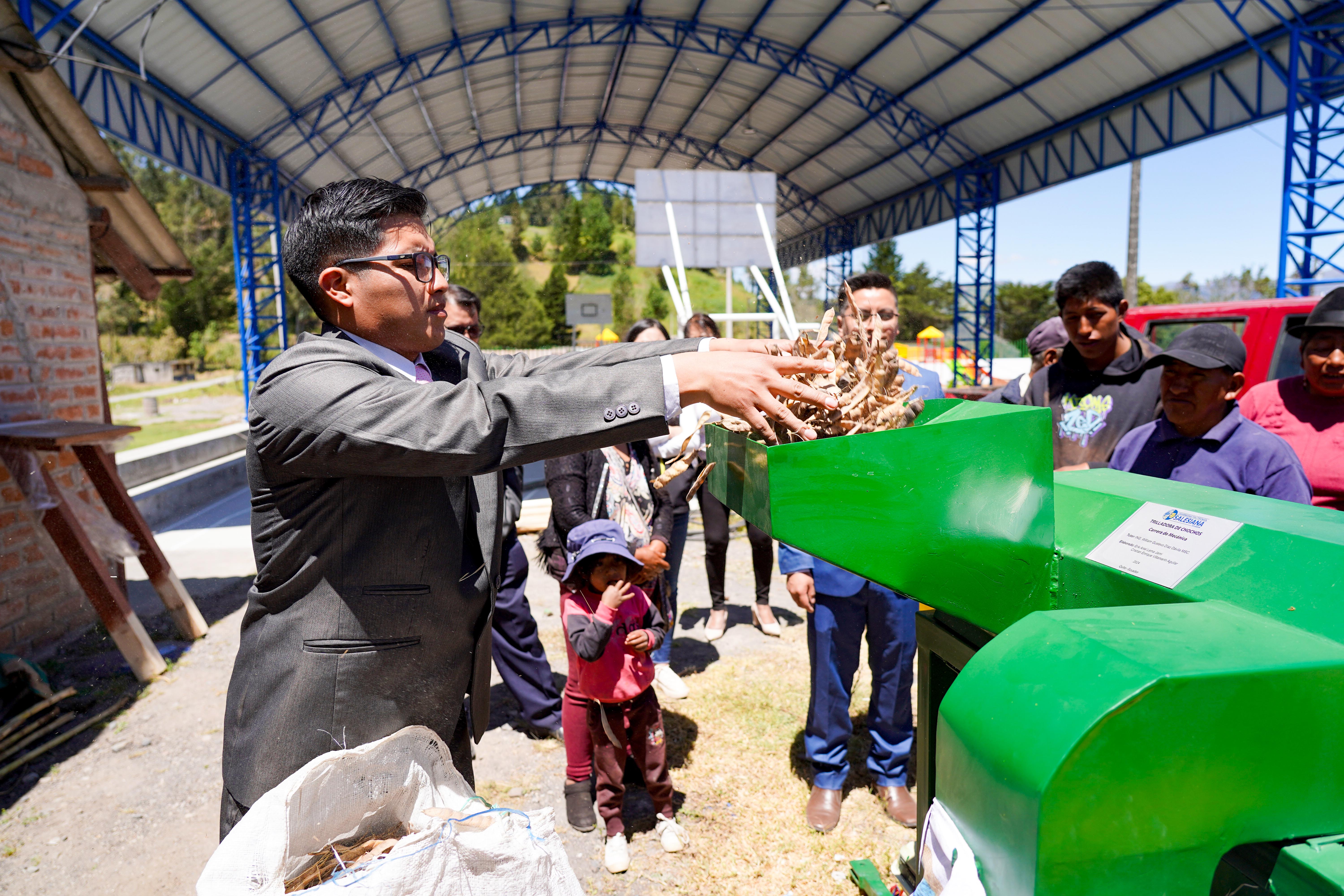 Cristian Villamarín, otro de los egresados de la carrera de Mecánica de la UPS, sede Quito, lleva a cabo una demostración práctica del proceso de trillado utilizando la nueva máquina. Ante la atenta mirada de los miembros de la comunidad de Quinticusig, Cristian explica y muestra cómo la trilladora opera de manera eficiente, separando los granos de chocho de sus vainas. Esta prueba no solo valida el diseño y construcción del equipo, sino que también asegura a los habitantes la viabilidad y beneficios de la tecnología implementada.