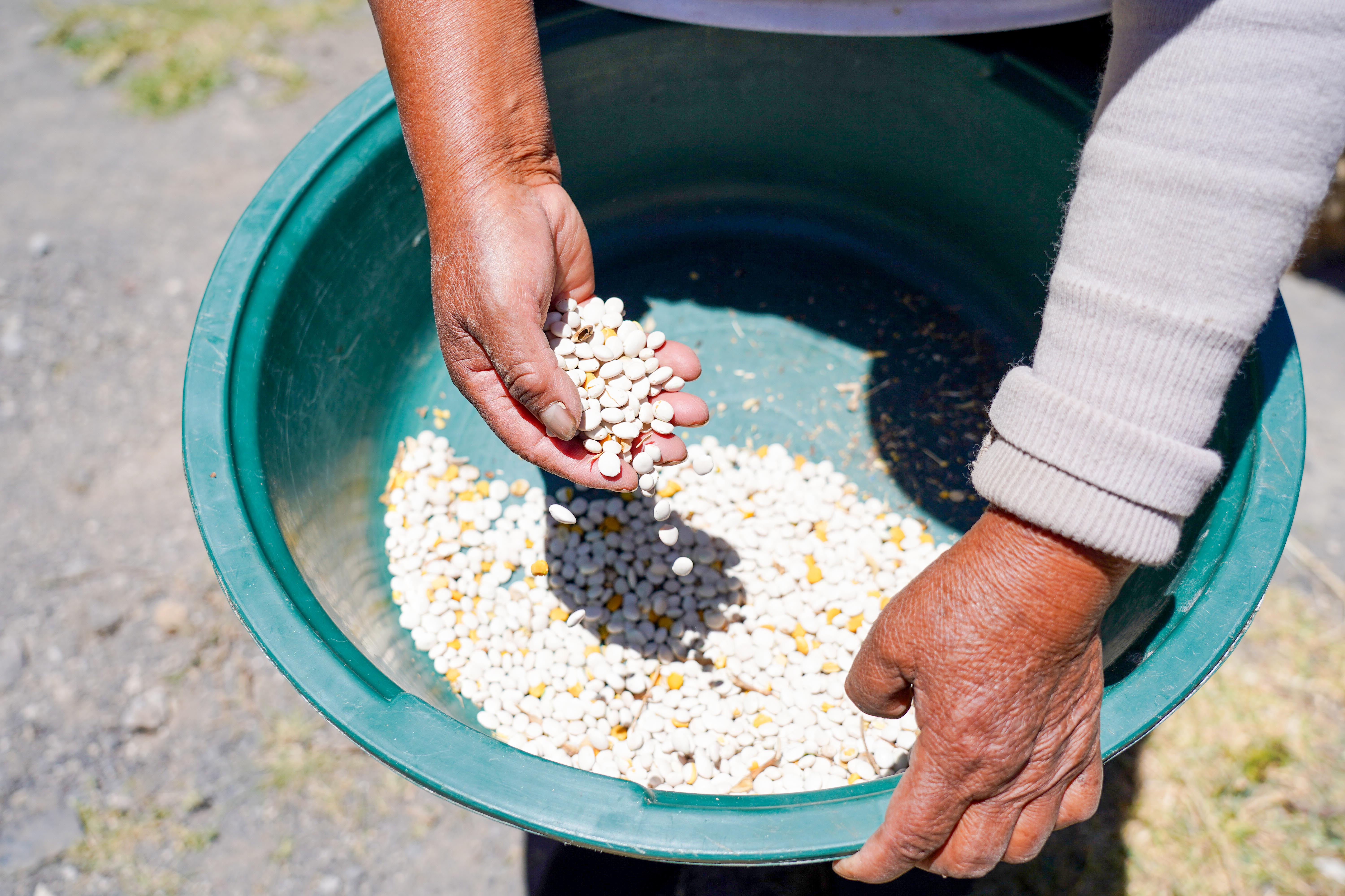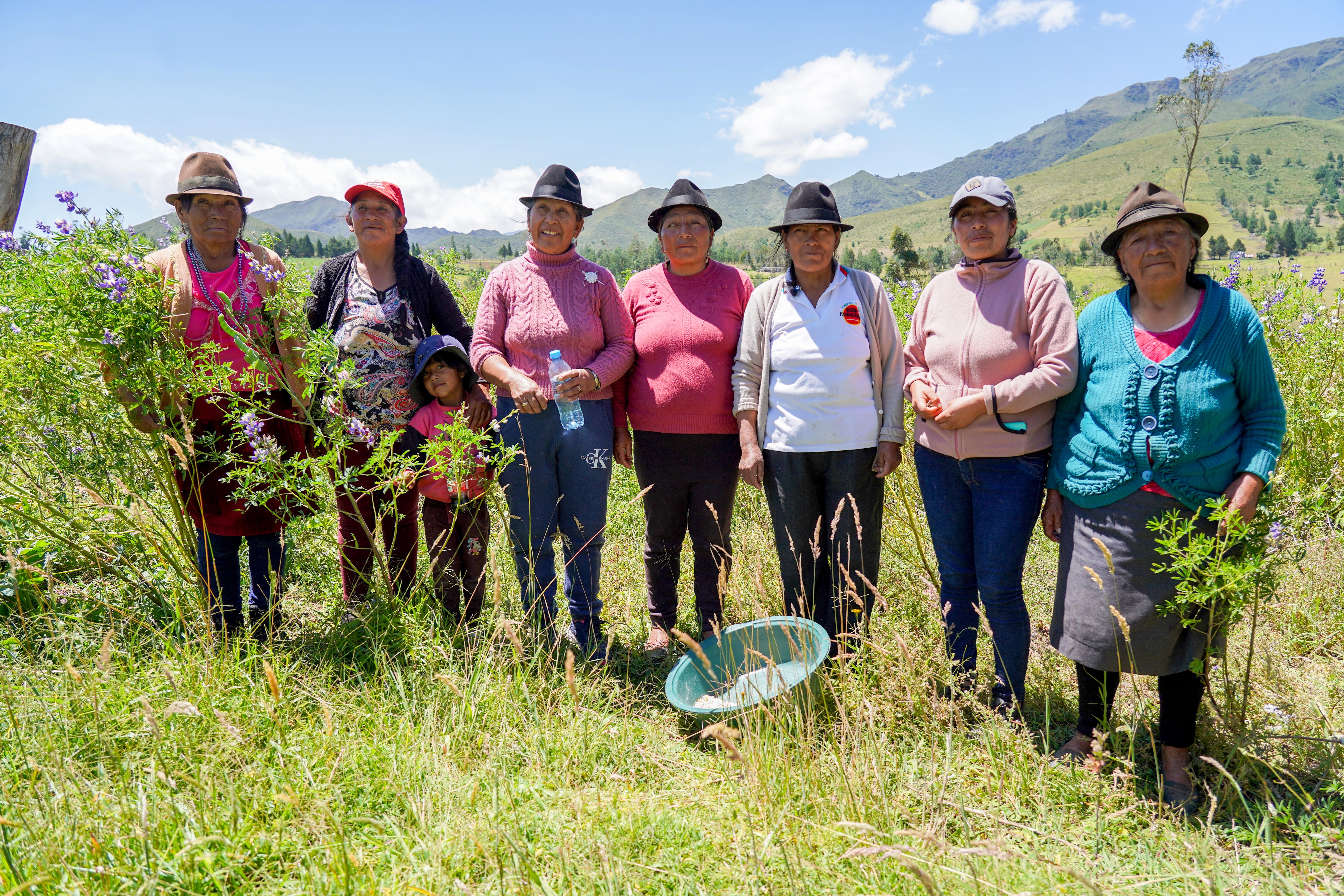 Tras el sembrío de chochos se encuentran Luz María Toapanta, Gladis Toapanta, María Gloria Toapanta, Dolores Ante, Diocelina Angamarca, Georgina Guaita y Delia Guaita. Ellas son mujeres que representan el arduo trabajo de la agricultura. Con sus manos y esfuerzo diario, cultivan la tierra para proporcionar alimentos y sustento a sus familias y a la comunidad de Quinticusig. Su dedicación y compromiso son ejemplos inspiradores de cómo la labor agrícola fortalece tanto el tejido social como la economía local. En esta imagen, se puede ver la unidad y el espíritu colaborativo que caracteriza a este grupo de mujeres trabajadoras y emprendedoras, que ahora cuentan con el apoyo de la nueva máquina trilladora para mejorar sus procesos productivos.