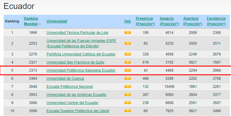 La Universidad Politécnica Salesiana (UPS) escala 323 posiciones en el ranking web de universidades Webometrics, mismo que evalúa el desempeño y productividad de las Instituciones de Educación Superior (IES) en Internet a nivel mundial, la publicación de este ranking fue socializada en este mes de julio mediante su portal web.