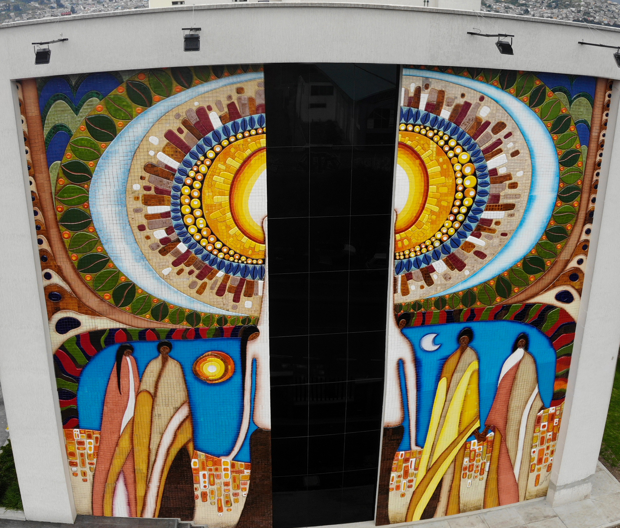 Ubicado en el bloque G con la fachada hacia la Av. Rumichaca, dispone los motivos según dos cuerpos verticales, en consonancia con la estructura edilicia de uno de los bloques del campus. Su estructura dual alude a la cosmología andina basada en la complementariedad masculina y femenina. En su parte superior, la imagen humanizada del sol se expande a lo ancho de ambas secciones.