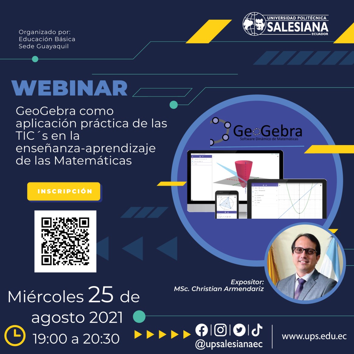 La Universidad Politécnica Salesiana (UPS) a través de la carrera de Educación Básica de la sede Guayaquil, invita a participar del Webinar: GeoGebra como aplicación práctica de las TIC´s en la enseñanza-aprendizaje de la matemática.