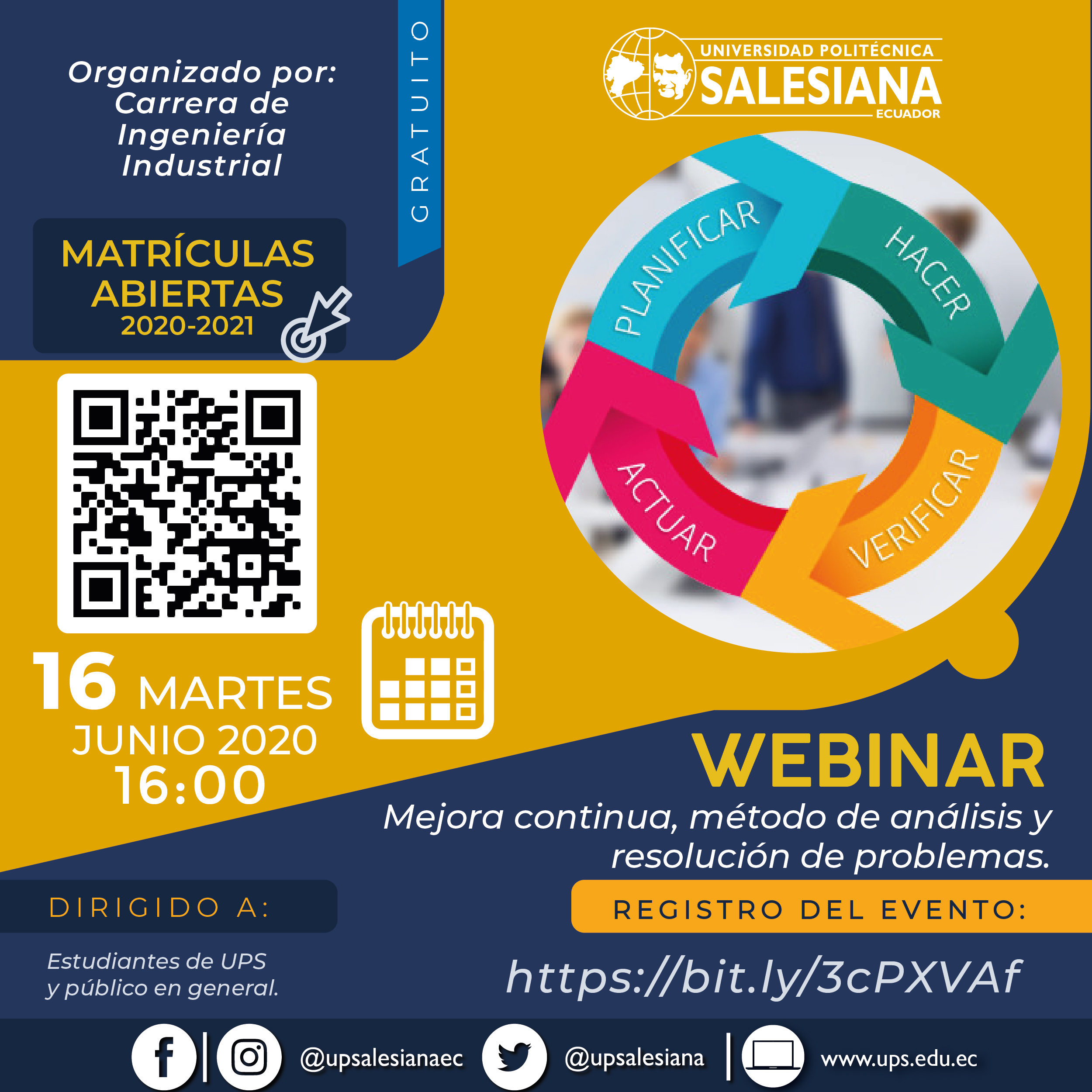 La Universidad Politécnica Salesiana (UPS), a través de la carrera de Ingeniería Industrial de la sede Guayaquil, invita a participar del Webinar: “Mejora continua, método de análisis y resolución de problemas”.